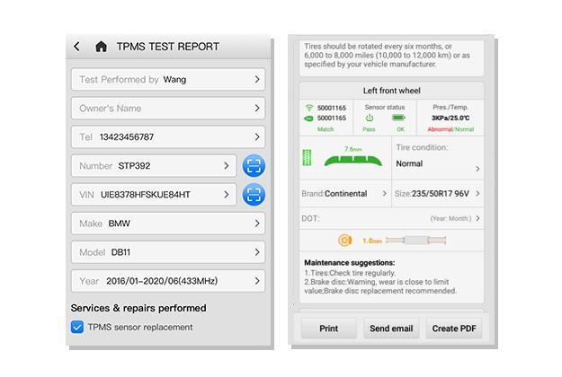 • Comprehensive Test Report: TPMS health, Tire tread depth & brake disc wear characteristics & Repair tips (Requires ITS600)