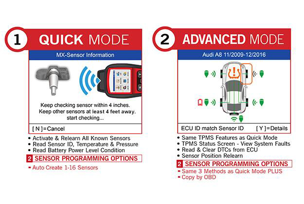 TPMS Quick Mode: basic TPMS functions to check TPMS sensors and program MX-Sensors quickly;
